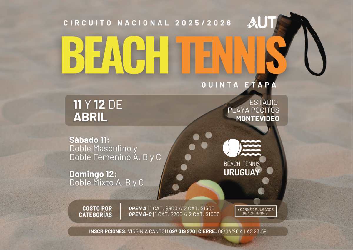 La Asociación Uruguaya de Tenis informa la realización de la quinta etapa del Circuito Nacional de Beach Tennis 2025/2026, que se llevará a cabo los días 11 y 12 de abril en el Estadio Playa Pocitos, Montevideo.